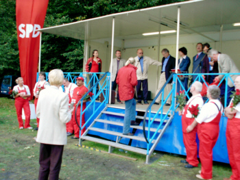 | Harald Schartau mit Frank Sichau und anderen Vorstandsmitgliedern vor seiner Rede auf der Tribüne im Schlosspark |